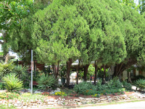 The patio is screened from view on the street side by a row of cedar trees with large yuccas at each end and a variety of annuals and perennials planted beneath the trees. To make the area more hospitable for plants, Otto used stones to build a retaining wall and added topsoil to create a raised bed.